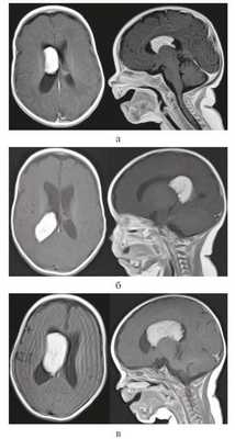 Рисунок 1. МРТ с контрастным усилением в аксиальной (слева) и сагиттальной (справа) проекции: ПСС тела и переднего рога правого бокового желудочка. а — возраст ребенка 1 мес; б — возраст ребенка 2 мес: миграция ПСС в задний рог правого бокового желудочка; в — возраст ребенка 3 мес: миграция ПСС в тело и передний рог правого бокового желудочка.