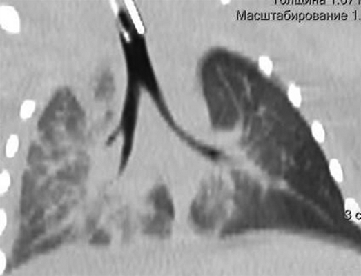 Рис. 3. Мультиспиральная компьютерная томография, мультипланарная реконструкция (MPR) легких в корональной проекции, в просвете трахеи интубационная трубка, пневматизация легких диффузно неравномерная с наличием участков ателектазированной легочной ткани