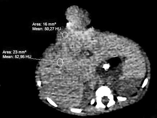 Девочке 2-х суток жизни выполнена МСКТ в условиях медикаментозной седации с проведением проспективной ЭКГ-синхронизации, болюсного внутривенного контрастирования (в/в) препаратом Визипак 270 в объеме 6 мл в периферическую вену правой нижней конечности. Сканирование осуществлено на аппарате Philips Ingenity 128, kv 80, mas 350, протяженность сканирования 250 мм. Выполнено обзорное сканирование грудной клетки и брюшной полости до контрастного усиления, по результатам которого определяется диффузная неравномерность пневматизации легочной паренхимы, с наличием участков ателектазированной легочной ткани в верхних и нижних долях легких с обеих сторон, в обеих плевральных полостях определяется умеренное количество выпота (рис. 3). Сердце визуализировано вне грудной полости (рис. 4). В грыжевом мешке определяется фрагмент паренхиматозного органа брюшной полости, по нативным денситометрических показателям идентичный паренхиме печени (50HU), как показано на рисунке 5.