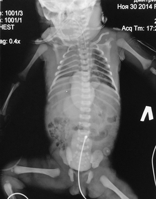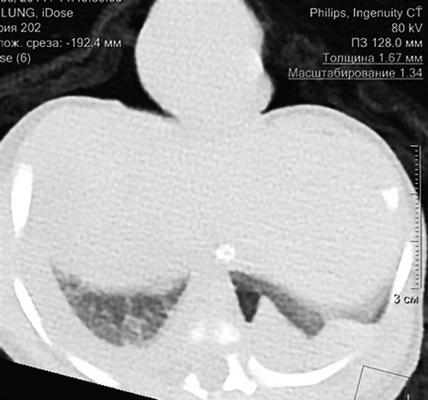 Ведущим симптомом в клинической картине являлась дыхательная недостаточность, требовавшая респираторной поддержки в жестких режимах традиционной искусственной вентиляции легких (ИВЛ), с переводом в дальнейшем на осцилляторную высокочастотную вентиляцию в течение двух дней. После чего отмечалась положительная динамика в виде перевода на традиционную ИВЛ с постепенным снижением параметров вентиляции, сменой на неинвазивные методы дыхательной поддержки (CPAP), масочную подачу кислорода в возрасте одного месяца 15 дней жизни. За время нахождения в отделении ребенок перенес аспирационную пневмонию.
