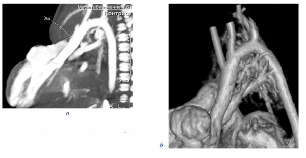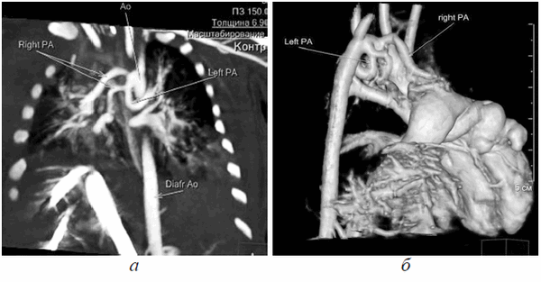 Источник кровоснабжения малого круга кровообращения в виде наличия легочной артерии (ЛА) отсутствовал, выходной отдел ПЖ не сформирован, правосторонняя предсердно-артериальная конкордантность нарушена. При детальной оценке полученных изображений визуализированы артериальные сосуды, отходящие от дуги Ао и направляющиеся к легким с обеих сторон. Общее количество больших аортолегочных коллатералей (БАЛК) — 2 (рис 8, а, б).