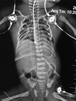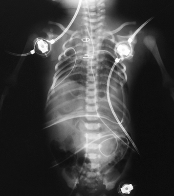 В раннем послеоперационном периоде состояние ребенка тяжелое, относительно стабильное, обусловлено дыхательной недостаточностью, сердечной недостаточностью, в том числе по причине врожденного порока сердца, объемом и травматичностью хирургического вмешательства. По завершении операции выполнена обзорная рентгенограмма грудной и брюшной полостей, на которой тень сердца расположена в левой половине грудной клетки (рис. 10), в верхних сегментах правого легкого сохраняется гиповентиляция, в остальных отделах легких признаки отека, контуры диафрагмы не четкие, в грудной и брюшной полостях определяются дренажи, в просвете трахеи интубационная трубка.