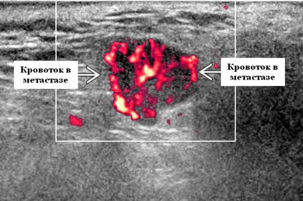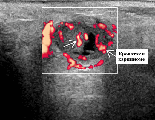 - Цветной допплер. Сигнал кровотока внутри очага поражения от умеренной до выраженной степени интенсивности