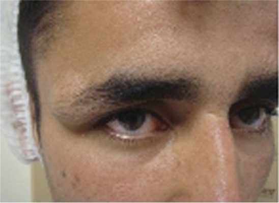 При расположении в наружном отделе орбиты основной жалобой больных было появление безболезненного невоспалительного отека верхнего века соответственно месту локализации кисты. Наблюдалось частичное опущение века с латеральной стороны (рис. 3). Кожа века в этом месте была растянута, но окраска ее не изменена. У больных с дермоидной кистой медиальной стенки орбиты опухоль располагалась в верхневнутреннем квадранте. Киста этой локализации неподвижна и связана с надкостницей (рис. 4). Ни у одного пациента мы не наблюдали появление диплопии, экзофтальма или изменения рефракции. У 3 больных выявлялся болевой симптом, связанный с воспалительным процессом в кисте.