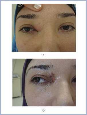 Рис. 7. Дермоидная киста орбиты до (а) и после (б) операции.