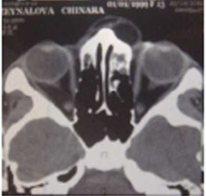 Все больные проходили КТ-исследование, благодаря которому можно изучить структуру самой опухоли, а также состояние подлежащих костей и степень распространения в орбиту. На К.Т. выявлялось образование округлой или овальной формы с четкими и ровными контурами. У всех кист отчетливо прослеживалась капсула, а также наличие серозного содержимого (рис. 5, 6). Узурацию костной стенки, описанную в литературе не встречали.
