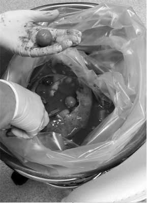 Данный случай примечателен не столько своими клиническими особенностями (хотя для доброкачественного дермоида нехарактерны такой быстрый рост, анемия, асцит, увеличение концентрации онкомаркеров и нарушения уродинамики), сколько эхографической картиной. Наличие свободно плавающих в полости кисты округлых образований примерно одинакового размера (рис. 3), Рис. 3. Новообразование вскрыто. Видно жидкое содержимое, в котором свободно плавают шаровидные структуры. несмотря на отрицательные результаты исследований, проведенных паразитологом, и отсутствие эозинофилии, не позволяло исключить паразитарную кисту вплоть до момента операции. Применение помимо УЗИ также КТ и МРТ с усилением не способствовало уточнению диагноза.