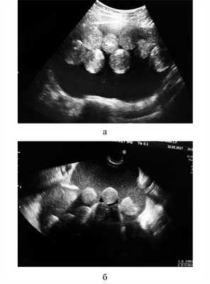 Необычными оказались результаты УЗИ органов малого таза. Матка визуализирована смещенной книзу, с четкими, ровными контурами, размером 35×31×33 мм, структура миометрия — однородная, М-эхо — 10 мм, соответствовало фазе менструального цикла (день менструального цикла на момент исследования 12-й). Шейка матки — 28×24 мм, обычного строения, канал шейки матки не расширен. Левый яичник — 41×27×31 мм, с мелкими фолликулами. В проекции правого яичника визуализировано объемное образование, выходившее из малого таза, занимавшее практически всю брюшную полость до гипогастрия. Контуры образования четкие, ровные, размер 190×100×180 мм, содержимое гетерогенное со взвесью и множественными округлыми гиперэхогенными образованиями внутри. Участков избыточной васкуляризации не выявлено. Имелось небольшое количество («следы») «свободной» жидкости в малом тазу. Заключение: объемное образование малого таза и гипогастрия, вероятнее всего, исходящее из правого яичника (Тератома? Паразитарная киста?) (рис. 1). Рис. 1. Эхографическая картина новообразования (а, б — различные сечения). Видны свободно плавающие в кистозной полости гиперэхогенные «шары» примерно одинакового строения и диаметра, на основании чего заподозрено наличие паразитарной инвазии.