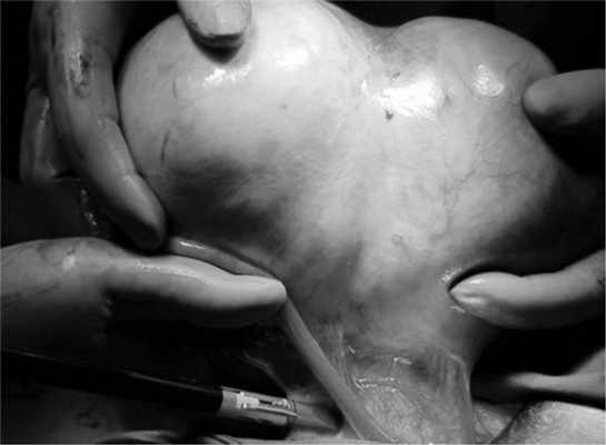 Экстренная операция. Нижняя срединная лапаротомия. Удаление правых придатков матки. Биопсия левого яичника. Резекция большого сальника. Типичным путем выполнена нижняя срединная лапаротомия. Обнаружено, что в полости таза имеется небольшое количество светлой жидкости (жидкость взята для цитологического исследования и посева), матка и ее левые придатки не изменены. Справа яичник представлен опухолевидным образованием до 20 см, его наружная капсула гладкая (рис. 2). Рис. 2. Опухоль выведена из брюшной полости. Маточная труба распластана по поверхности образования, фимбрии выражены, брюшина не изменена.