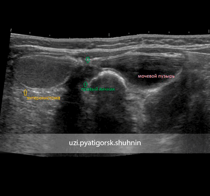УЗИ брюшной полости ребенка 3-х месяцев. Направлен с диагнозом «киста правого яичника». При исследовании выявлено кистозное образование, прилежащее к поверхности правого яичника, но не исходящее из него, со специфическим строением стенки, с негомогенным жидкостным содержимым. Диагноз кисты яичника исключен, установлен диагноз энтерокистомы. Пациентка направлена на консультацию хирурга. Своевременная и верная диагностика позволила уберечь ребенка от возможного негативного сценария развития этого заболевания.