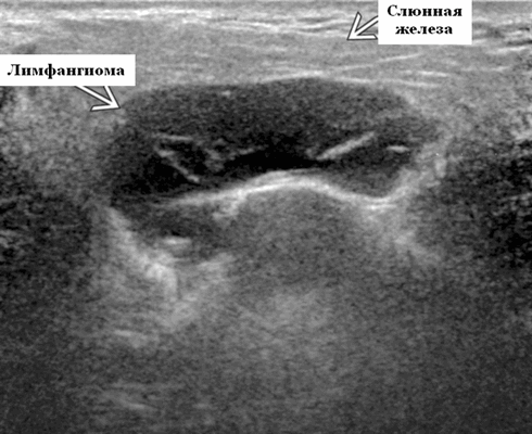 Результаты ультразвукового исследования. Серошкальное УЗИ. Более крупные околоушные лимфангиомы могут быть обнаружены при пренатальном УЗИ. Чаще мультилокулярный, чем монокулярный. Кистозные пространства могут быть округлыми или вкраплениями. Поверхностные поражения сжимаются ультразвуковым датчиком. Внешний вид зависит от того, было ли ранее кровотечение / инфекция. Негеморрагический / неинфицированный лимфаангимоы выглядят на УЗИ как однокамерные или многокамерные (чаще) анэхогенные сжимаемые кисты с тонкими стенками и промежуточными септами. Несмотря на большие размеры, существенного масс эффекта нет. Тонкие незаметные стенки с задним акустическим усилением. Цветной допплер: в области поражения нет кровеносных сосудов. Геморрагический / инфицированный тип лимфатической мальформации. Однокамерные или многокамерные гетерогенные кисты с неровными стенками, внутренним дебрисом. Несжимаемые датчиком и гипоэхогенные полости с толстыми стенками и перегородками. Уровни жидкости-жидкости из-за осаждения и разделения жидкостей предполагают предшествующее кровотечение. Цветной допплер: при заражении; васкуляризация может быть видна в стенках, перегородках и прилегающих мягких тканях