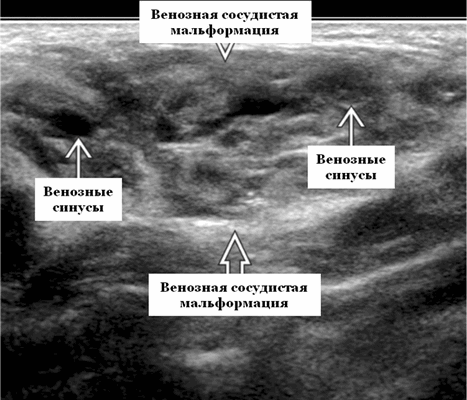 Результаты ультразвукового исследования. УЗИ в серошкальном режиме. Большинство сосудистых венозных гемангиом (80%) выглядят неоднородно гипоэхогенными. Большие анэхогенные сосудистые пространства видны менее чем в 50% случаев, серпигинозные и синусоидальные. Поражения с небольшими сосудистыми каналами могут казаться эхогенными (из-за множества акустических границ, отражающих звук). Определить пределы образования бывает трудно, так как компоненты поражения могут быть изоэхогенными в околоушной паренхиме и незаметно смешиваться. Внутрипросветное движение эхо-сигналов при УЗИ в реальном времени, представляющее медленный сосудистый кровоток. Характерны эхогенные флеболиты с задним акустическим затенением. Сообщается, что они присутствуют только в 20% ВСМ. Иногда поражается вся околоушная железа, имитируя диффузную или инфильтративную патологию. Целесообразность склеротерапии оценивается соотношением сосудистых пространств к эхогенной матрице