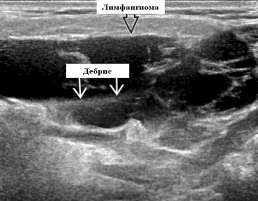 Результаты ультразвукового исследования. Серошкальное УЗИ. Более крупные околоушные лимфангиомы могут быть обнаружены при пренатальном УЗИ. Чаще мультилокулярный, чем монокулярный. Кистозные пространства могут быть округлыми или вкраплениями. Поверхностные поражения сжимаются ультразвуковым датчиком. Внешний вид зависит от того, было ли ранее кровотечение / инфекция. Негеморрагический / неинфицированный лимфаангимоы выглядят на УЗИ как однокамерные или многокамерные (чаще) анэхогенные сжимаемые кисты с тонкими стенками и промежуточными септами. Несмотря на большие размеры, существенного масс эффекта нет. Тонкие незаметные стенки с задним акустическим усилением. Цветной допплер: в области поражения нет кровеносных сосудов. Геморрагический / инфицированный тип лимфатической мальформации. Однокамерные или многокамерные гетерогенные кисты с неровными стенками, внутренним дебрисом. Несжимаемые датчиком и гипоэхогенные полости с толстыми стенками и перегородками. Уровни жидкости-жидкости из-за осаждения и разделения жидкостей предполагают предшествующее кровотечение. Цветной допплер: при заражении; васкуляризация может быть видна в стенках, перегородках и прилегающих мягких тканях
