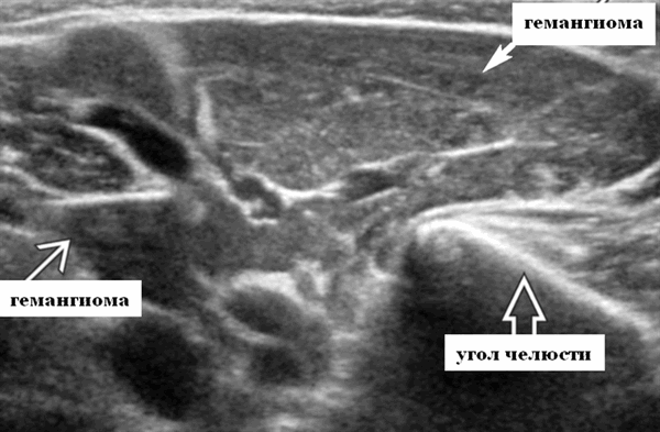 - Гемангиома. Встречается в младенчестве и раннем детстве. Гомогенно гипоэхогенный вид при ультразвуковом сканировании. Распространенная и выраженная гиперваскуляризация на цветном допплеровском исследовании и усиление на КТ / МРТ. Отсутствие флеболитов