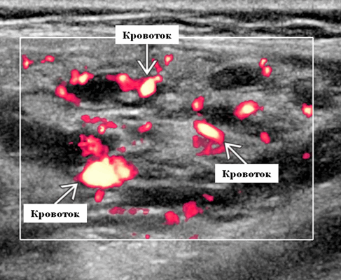 Энергетический допплер. Отмеченный доплеровский сигнал потока на всем протяжении пораженных сосудов