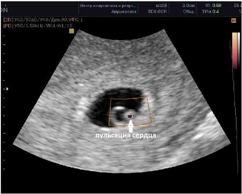 Внутри плодного яйца мы видим "колечко с драгоценным камнем" :) - это желточный мешок и уже хорошо различимый эмбрион, расположенные рядом. Сердце эмбриона начинает биться в начале 6-й акушерской недели беременности. Именно наличие пульсации сердца является достоверным ультразвуковым признаком прогрессирующей беременности. При КТР ≥6 мм и отсутствии пульсации сердца делается заключение об остановке развития данного эмбриона. Нормальная частота сердечных сокращений (ЧСС) эмбриона в самом начале 6-й недели 70-90 ударов в минуту, но уже к концу недели становится более 100 уд. в мин. На ранних сроках беременности большее значение имеет не ЧСС, а как таковое наличие или отсутствие сердечных сокращений. Иногда, при неразвивающейся беременности можно увидеть отражение пульсации сосудов матери внутри эмбриона и принять их за сердцебиение ребёнка. Но в этом случае частота пульсации будет идентична ЧСС матери.