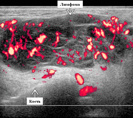 Цветовой допплер: смешанная сосудистая сеть с выраженными внутриузловыми сосудами и наличием периферической сосудистой системы. Одна только периферическая сосудистая сеть редко встречается в узлах НХЛ. Спектральный допплер: переменное интранодальное внутрисосудистое сопротивление, которое носит неспецифический характер.