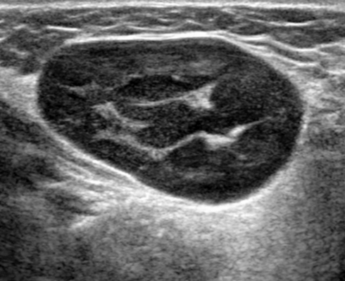 Обычно на УЗИ это гипоэхогенный лимфоузел по сравнению с соседними мышцами и ранее описывалось как псевдокистозные узлы с задним усилением. При использовании более старых преобразователей внутренние эхосигналы в узлах были очень низкими, почти анэхогенными, напоминающими кисту. Используя современные датчики высокого разрешения, несмотря на их солидную природу, мы видим, что узлы НХЛ имеют тенденцию к заднему усилению. Равномерная клеточная инфильтрация внутри узлов создает меньше границ между структурами и облегчает прохождение ультразвука. Это, в сочетании с низкой внутренней эхогенностью, приводит к так называемому псевдокистозу. Лимфоузлы неходжкинской лимфомы показывают интранодальный ретикулярный или микронодулярный рисунок с использованием более новых преобразователей высокого разрешения