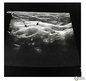 У одного пациента в подмышечной области визуализировался конгломерат ЛУ с размытыми контурами, неправильной формы, дифференциация на кору и ворота отсутствовала. По данным УЗИ, данный конгломерат напоминал метастатические ЛУ с инфильтрацией окружающей клетчатки. Однако кожа над конгломератом была гиперемирована, повышенной температуры, болезненная при пальпации, клинические исследования указывали на наличие воспалительного процесса. Поэтому, опираясь на клинические признаки, был заподозрен острый лимфаденит с развитием периаденита (рис. 6). В результате адекватной противовоспалительной терапии он благополучно разрешился.