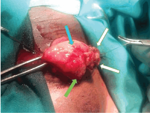 The figure shows hemorrhagic sites of urinary bladder mucous membrane caused by acute schistosomal inflammation (indicated by a blue arrow), granulomatous formations (white arrows) and areas of squamous cell metaplasia (green arrow). Tumor-like formation more than 1 cm in diameter in the urinary bladder lumen on the unchanged mucosa background.