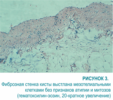 По своему строению ПМКБП — тонкостенная, однокамерная киста брюшной полости, обычно с серозным содержимым [7]. Внутренняя поверхность полости выстлана плоскими, кубическими или цилиндрическими мезотелиальными клетками, стенка — фиброзная, без каких‑либо мышечных или лимфатических структур [2, 7]. Цитологический анализ ПМКБП показывает, что у клеток правильное круглое ядро, одно ядрышко и большое количество цитоплазмы [2].