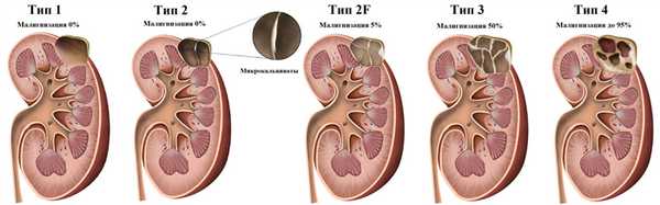 Рисунок. Классификация кист почек по Bosniak. Кисты тип 1 и 2 доброкачественные и не требуют дальнейшей оценки. Кисты тип 2F, 3 и 4 требуют дополнительных исследований.