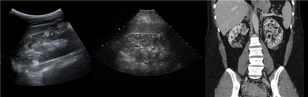 Рисунок. На УЗИ (1) и КТ (2, 3) контур почек волнистый. У эмбриона почка развивается из отдельных долек, которые сливаются по мере их роста. Дольчатое строение почек хорошо видно у плода и новорожденных, в единичных случаях сохраняется у взрослых.
