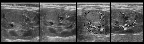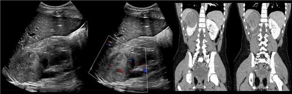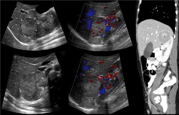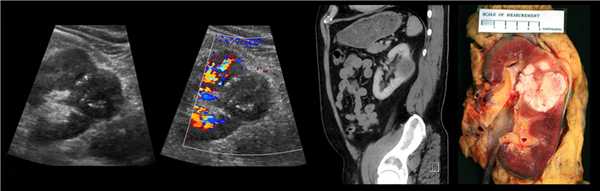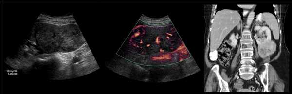 Рисунок. На УЗИ (1, 2) из нижнего полюса левой почки исходит неправильной формы масса, размер 50х100 мм; паренхима изоэхогенная неоднородная за счет кистозных полостей; активный внутренний кровоток. Это типичная УЗИ-картина почечно-клеточного рака.