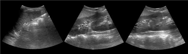 В положении пациента на спине по среднеключичной и переднеподмышечной линии выводим правую почку в соседстве с печенью, а левую почку вблизи селезенки. Оцените эхогенность почек. Корковый слой почки в норме изо- или гипоэхогенный по отношению к печени и гипоэхогенный по отношению к селезенке.