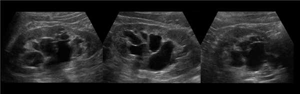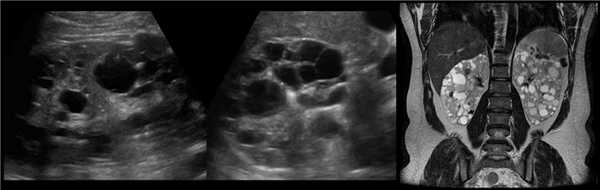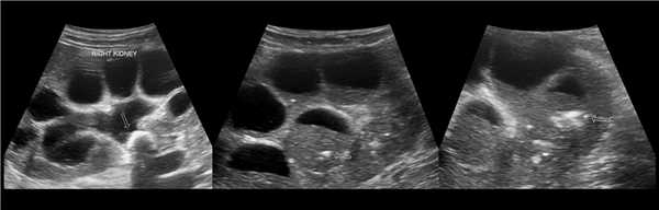 При поликистозе почек множественные кисты различного размера заполняют практически всю почку. На поздних стадиях заболевания, почки увеличены и отсутствует кортикомедулярная дифференцировка. Подробнее смотри Поликистоз почек на УЗИ.