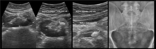 Рисунок. Пациент с жалобами на дискомфорт при мочеиспускании. На УЗИ правая почка расположена в малом тазу, сосудистый пучок от подвздошных сосудов (1); в лоханке гиперэхогенное включение с акустической тенью позади, размер 10х10 мм (3, 4). Заключение: Тазовая дистопия правой почки. Эхо-признаки конкремент в лоханке справа. На рентгене (4) по средней линии над S1 позвонком округлое рентгенконтрастное включение.
