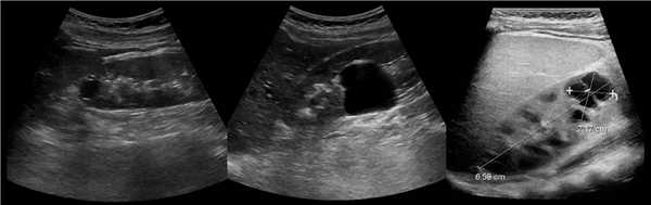 Рисунок. На УЗИ простая (1, 2) и сложная (3) кисты почки. При отсутствии выхода мочи паренхима симметрично раздвигается во все стороны, образуя округлые паренхиматозные кисты. Паренхиматозные кисты никуда не исчезнут, могут только разорваться.