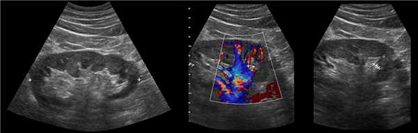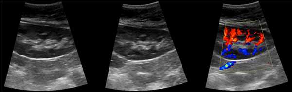 Рисунок. На УЗИ синус почек широкий, неоднородной эхоструктуры (1, 2). На фоне гиперэхогенного жира гипоэхогенный очаг округлой формы (2), при ЦДК междолевые сосуды проходят через гипоэхогенную зону без смещения (3) — это гипоэхогенный жир. При ожирении липоматоз синуса можно ошибочно принять за атрофию паренхимы.