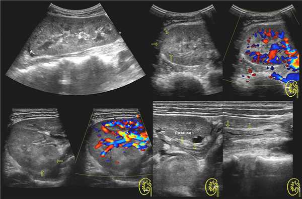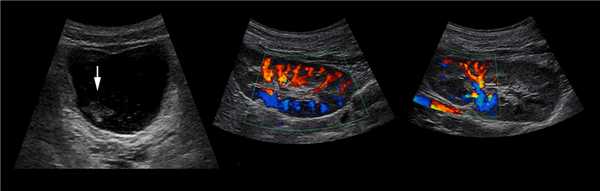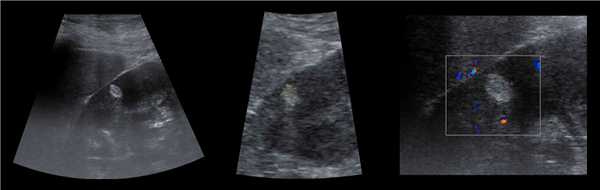 Рисунок. Ребенок с высокой температурой и лейкоцитурией. На УЗИ в мочевом пузыре большое количество гиперэхогенной взвеси; левая почка без особенностей; у верхнего полюса правой почки определяется гипоэхогенная зона с ослабленным кровотоком. Заключение: УЗИ-картина может соответствовать инфекции мочевыводящих путей (цистит, пиелонефрит справа).