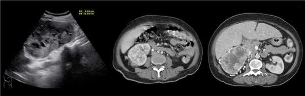 Рисунок. На УЗИ (1) у верхнего полюса правой почки исходит гиперэхогенная неоднородная масса с кистозными полостями, контур бугристый, размер 70х120 мм. Необходимо дифференцировать опухоль почки и надпочечника. Заключение по результатам биопсии: Почечно-клеточный рак правой почки.