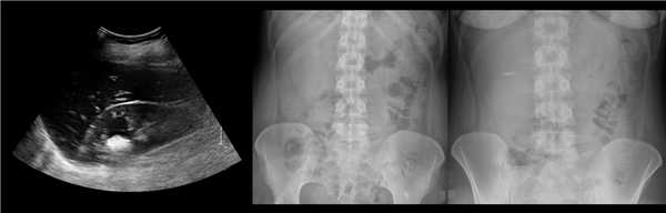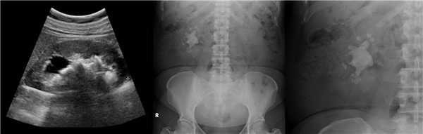 Рисунок. На УЗИ (1) в правой почке определяется округлая полость анэхогенным и гиперэхогенным компонентом, которые меняют форму при поворотах пациента. На рентгене в положении лежа (2) в верхнем полюсе правой почки округлое рентгенконтрастное образование; в положении стоя (3) видно рентгенконтрастный уровень. Заключение: Киста почки с кальциевым молочком. Чаще всего кальциевое молоко скапливается в простых кистах паренхимы или дивертикулах чашечки. Если киста заполнена полностью, постановка диагноза проблематична.