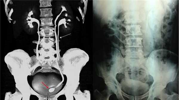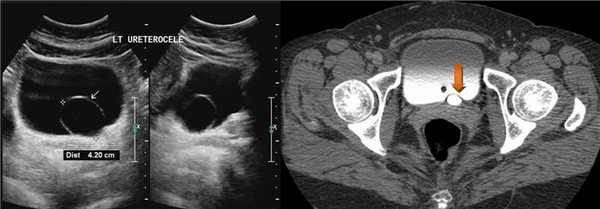 Рисунок. Уретероцеле (стрелка) на УЗИ и КТ.