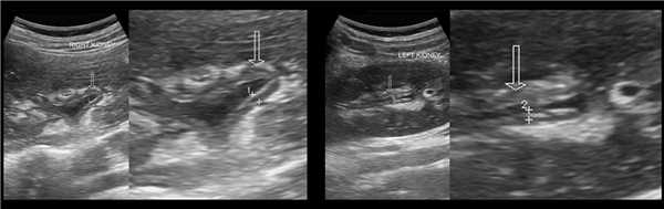 Рисунок. У новорожденного на УЗИ почек определяется гидронефроз (1) и расширенный мочеточник (2) справа. В мочевом пузыре двустороннее уретероцеле (3). При исследовании левой почки структурных изменений не выявлено.