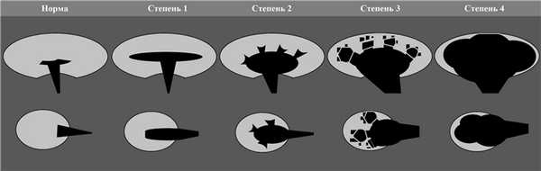 Степень 4 — чашечки округлой формы, почка сильно увеличена, значительное истончение паренхимы.