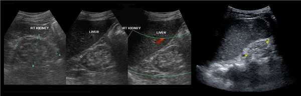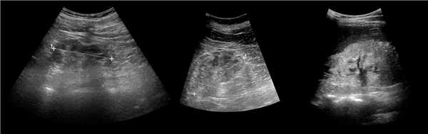Рисунок. На УЗИ пациент с ХПН (1, 2, 3): почки уменьшены в размерах до 70х40 мм, толщина паренхимы 7 мм, кортикомедуллярная дифференцировка сглажена. На УЗИ терминальная стадия ХПН: почка очень маленькая — 36 мм, эхогенность значительно повышенна, различить паренхиму и синус не представляется возможным.
