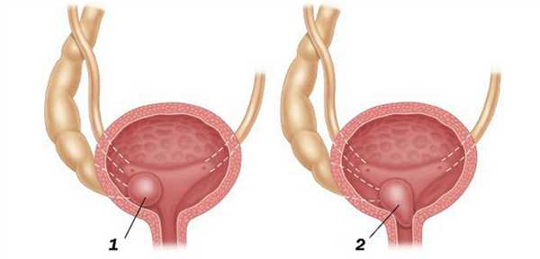 Рисунок. Внутрипузырный (1) и внепузырный (2) уретероцеле.