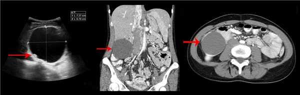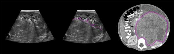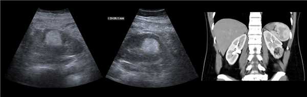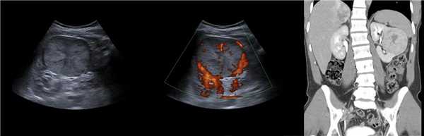 Рисунок. На УЗИ (1, 2) в брюшной полости определяется огромная неоднородная масса. На КТ (3) видно, что опухоль исходит из забрюшинного пространства слева. Левая почка придавлена, паренхима почки не изменена. Заключение по результатам биопсии: Нейробластома. Эта опухоль симпатической нервной системы в 35% случаев происходит из надпочечников, в 30-35% — из забрюшинных ганглиев, в 20% — из заднего средостения, 1-5% — на шее и 2-3% — в тазу.