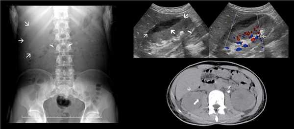 Рисунок. Пациент с мочекаменной болезнью поступил с острой болью в пояснице слева. На рентгене (1) границы правой почки увеличены, рентгеноконтрастные камни в обеих почках (треугольники). На УЗИ (2, 3) в правой почке чечевицевидное аваскулярное гипоэхогенное образование с неоднородной эхоструктурой сдавливает паренхиму; в зоне ЧЛК гиперэхогенный очаг с дорзальной тенью (треугольник), при ЦДК артефакт мерцания. Заключение: Субкапсулярная гематома правой почки. Конкремент в ЧЛК справа, без признаков обструкции. На КТ в правой почке субкапсулярная гематома и конкремент в лоханке; в левой почке конкремент в мочеточнике и вторичный гидронефроз 2-3 степени.