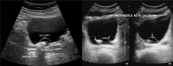 На УЗИ в мочевом пузыре или в уретре определяется анэхогенное образование, округлой формы, с четким и ровным контуром; соответствующий мочеточник обычно заметно расширен; может присутствовать гидронефроз верхней части удвоенной почки. Уретероцеле определяют как внутрипузырные (полностью внутри мочевого пузыря) или внепузырные (некоторая часть постоянно расположена в шейке мочевого пузыря или в уретре).