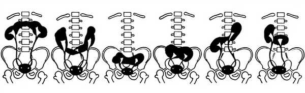 Рисунок. Дистопия почек по отношению к скелету: грудная справа (1), двусторонняя поясничная (2), тазовая слева (3), поясничная справа и тазовая слева (4), поясничная удвоенной левой почки (5), перекрестная (6).