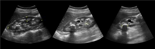 Рисунок. У 37% здоровых новорожденных в первые сутки жизни на УЗИ определяются гиперэхогенные пирамидки без акустической тени. Преципитация белка Тамма-Хорсфалла и мочевой кислоты вызывает обратимую обструкцию канальцев. К 6 неделям жизни проходит без лечения.