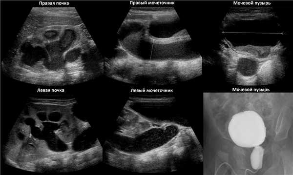Рисунок. Мальчик в возрасте 5-ти месяцев с инфекцией мочевыводящих путей. На УЗИ двусторонний гидронефроз 3-4 степени (1, 4), двусторонний мегауретер (2, 5). В просвете мочевого пузыря, мочеточников и ЧЛК определяется гиперэхогенная взвесь. При цистографии расширена предстательная часть мочеиспускательного канала, что указывает на клапан задней уретры. При трансперинеальном УЗИ возможно видеть задний клапан уретры. Подробнее смотри здесь.