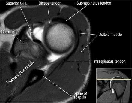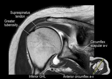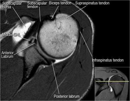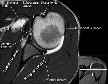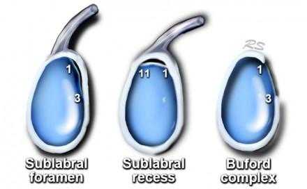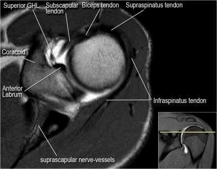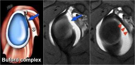 - уровень средней плече-лопаточной связки и передних отделов суставной губы. Поищите комплекс Буффорда. Изучите хрящи.