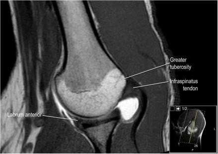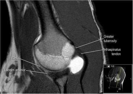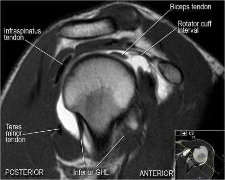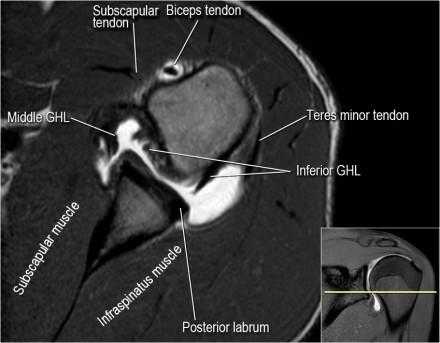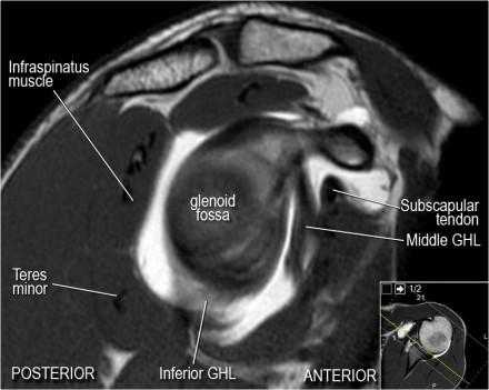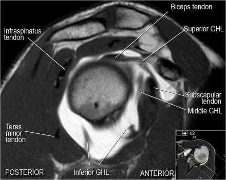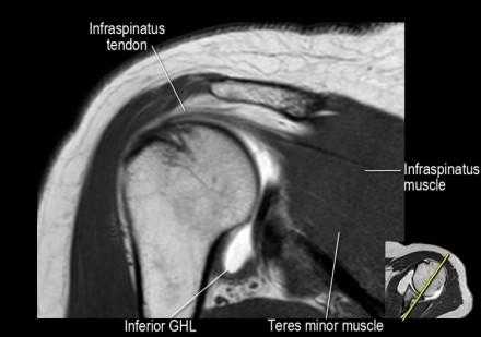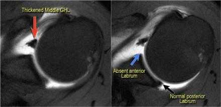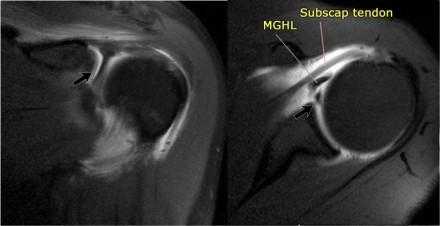 - изучите область прикрепления нижней плече-лопаточной связки. Изучите нижний комплекс суставной губы и связок. Поищите HAGL-повреждение (humeral avulsion of the glenohumeral ligament).