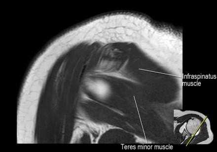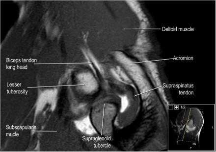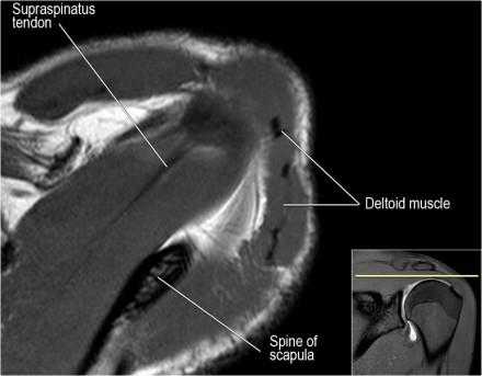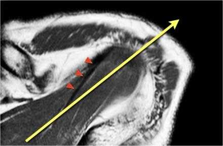 Подвергаясь тендинопатие и повреждению, сухожилие надостной мышцы является важнейшей частью манжеты вращателей. Повреждения сухожилия надостной мышцы лучше видны в косой корональной плоскости и в положении отведения и поворота плеча кнаружи (ABER - abduction external rotation). В большинстве случаев ось сухожилия надостной мышцы (головки стрелок) отклонена кпереди от оси мышцы (желтая стрелка). При планировании косой корональной проекции лучше ориентироватьия на ось сухожилия надостной мышцы.